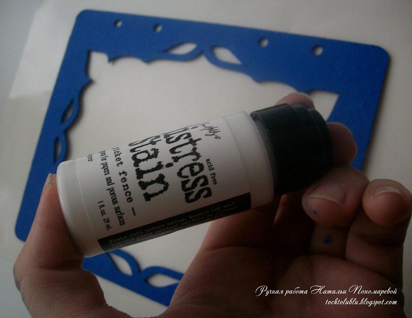 4. Синий цвет моей рамки был немного ярковат, поэтому я покрыла высохшую рамку белым Distress Stain.